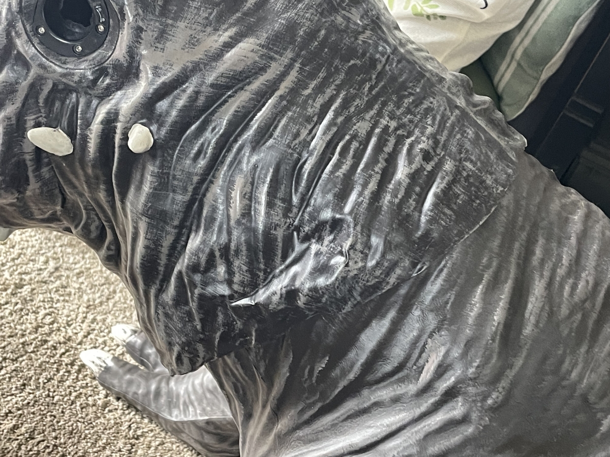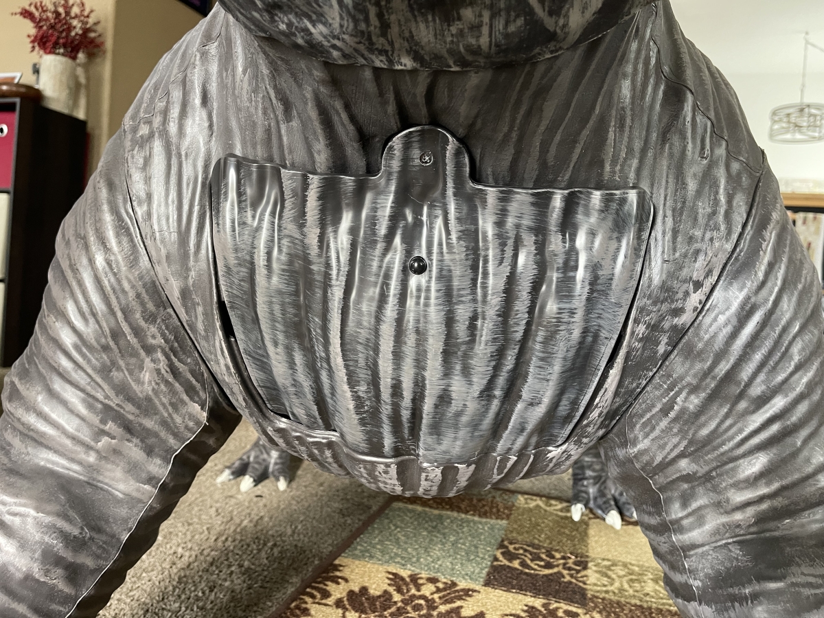 If you read my review of Slimer from last year, you know that I had a few issues with that decoration’s design. And judging from the improved quality of the Terror Dog, the prop designers at HalloweenCostumes.com were paying attention. Gaps are much less noticeable, in part due to the latex neck piece on the Terror Dog’s head. The plastic where the single screw secures the chest piece to the body is nice and thick, so that it should allow for screwing and unscrewing the panel without losing the integrity of the plastic.