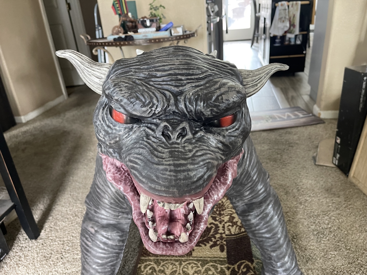 And the good news is, much like with Slimer, the 2.75FT Ghostbusters Animatronic Terror Dog Decoration is life-sized and looks dead-on like its counterpart in the film. I appreciate that the two sets of horns are included, so that you can choose which version of the Terror Dog you wish to display. And of course, if you’re planning a Ghostbusters display for Halloween, ideally you’ll have two of the Terror Dogs, so that you can have both a Zuul and a Vince Clortho flanking Gozer. I’ll have just the one, but he’ll look great alongside Slimer.