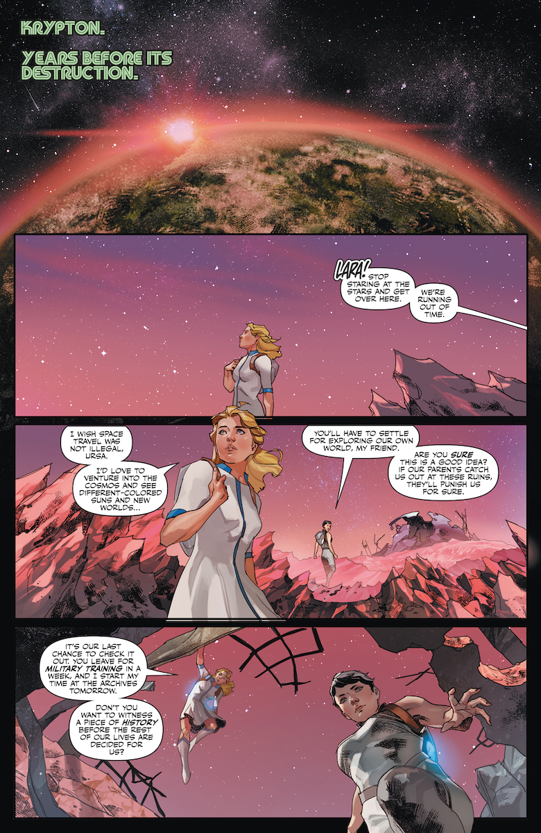 But I was equally fascinated by the other segment in this issue, a flashback to Krypton, as two teenage girls – Lar and Ursa – spend the days before they head off to classes for their respective science and military training by exploring ancient ruins. The curious Lara and the cautious, rule-following Ursa discover some forbidden artifacts, encounter what looks like Doomsdogs – and discover an ancient item that has ties to Darkseid. This segment is so fascinating because not only does it give the women by Jor-El and Zod’s sides their own story and stake in Krypton, but it possibly rewrites everything we know about Doomsday. He’s a monster, but he’s actually one of Superman’s most tragic villains – forcibly evolved into an indestructible killing machine by an ancient Kryptonian mad scientist. Is there still some humanity under there – and why was the scientist so obsessed with creating the ultimate warrior? This was a great set-up for what’s sure to be an over-the-top action-packed event.